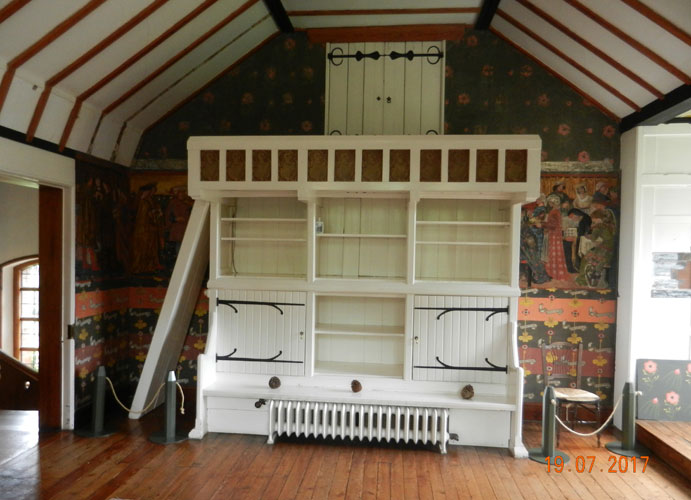 Settle in drawing-room with wall painting by Edward Burne-Jones